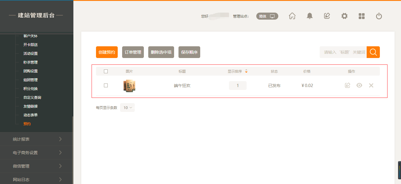 1.后台“小程序应用”-“预约”中,点击“创建预约”,里面可以添加该预约产品的信息内容,点击“保存”后,页面会显示该预约内容。